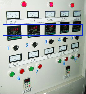 4、開關下面為主機電流表(8A) 風機電流表(~2A) 電源電壓     副機電流表(~1A)   備用電流表(XXX)