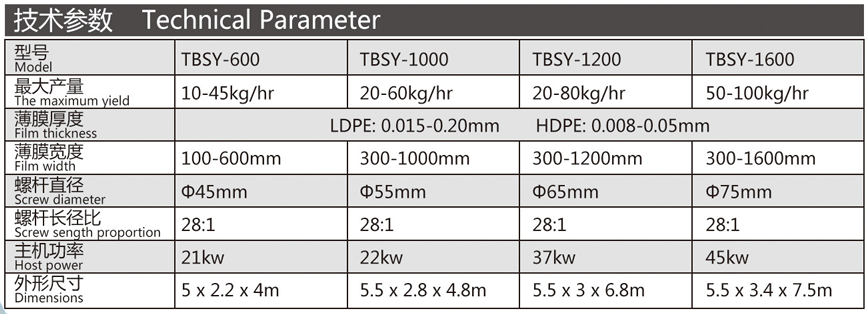 吹制各種規(guī)格的低密度聚乙烯、高密度聚乙烯和線性低密度聚乙烯塑料薄膜,廣泛應(yīng)用于食品百貨、日用、化工、針紡品、購物禮袋和工業(yè)包裝。機筒、螺桿采用38CrMOAI合金材料經(jīng)氨化處理精密加工而成具有很好的耐磨和耐腐蝕性。